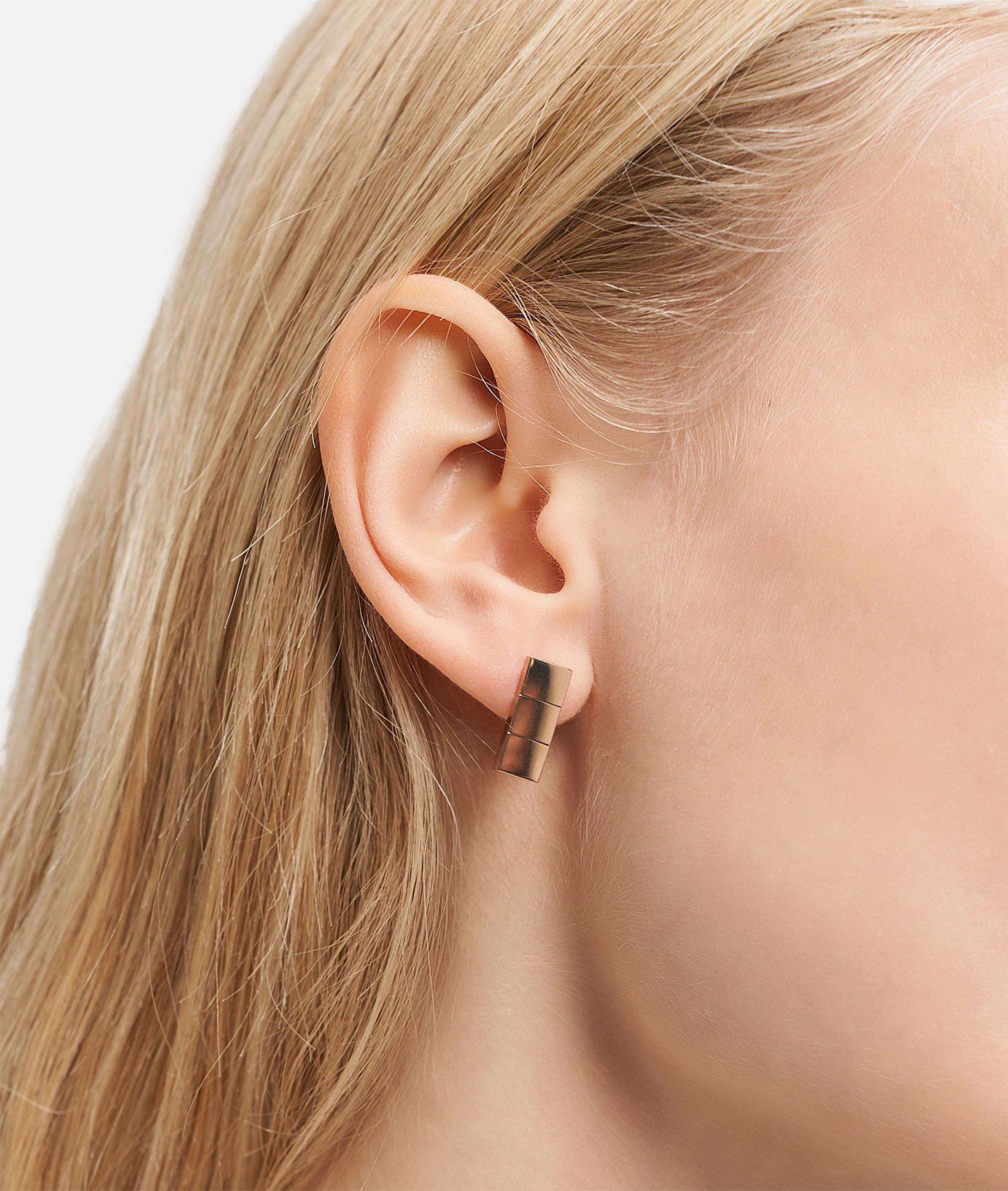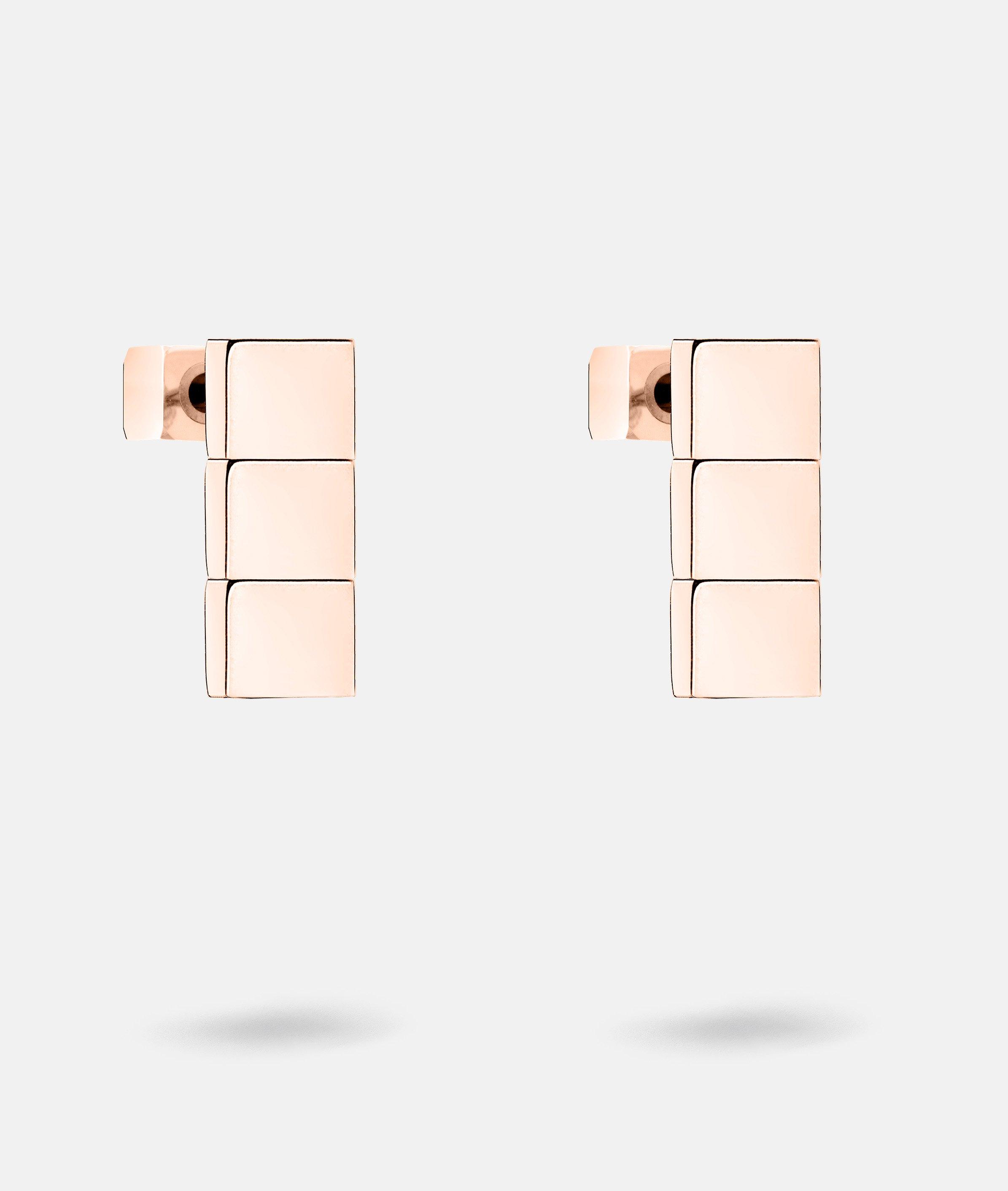 Diese Ohrstecker überzeugen mit einem cleanen, architektonischen Look: Drei kleine Metallplatten sind senkrecht miteinander verbunden und sorgen für stilvolle Bewegung bei jedem Schritt. Das minimalistische Design trifft auf urbane Eleganz – perfekt für moderne Statements mit Understatement.